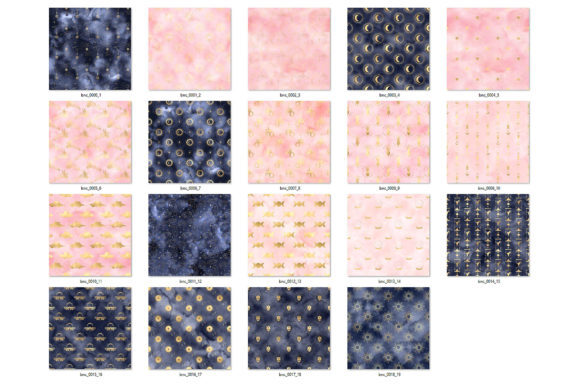 These lovely mystical backgrounds feature celestial imagery of crystals, creatures, suns, moons, stars and more in shimmering faux gold foil on watercolor textures in blush pink and navy blue. Perfect for party props, invitations, scrapbooking, or web backgrounds. Each image measures 12 x 12 inches (30.5 x 30.5 cm) and has 300 dpi resolution for the best quality printing. These are in seamless format.